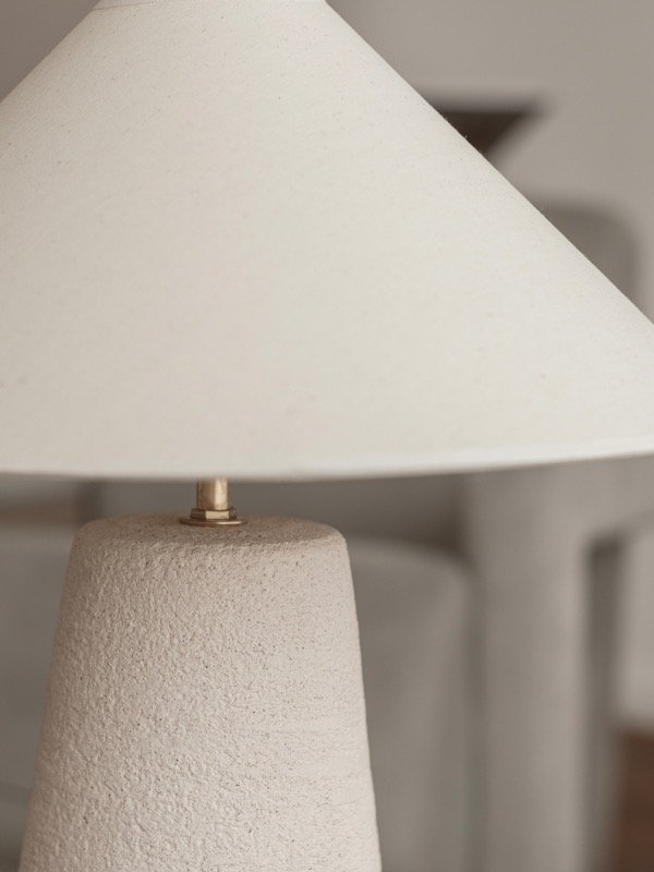 Lámpara de Cerámica acabado piedra símil Travertino con pantalla en lino natural y portalámparas color bronce.